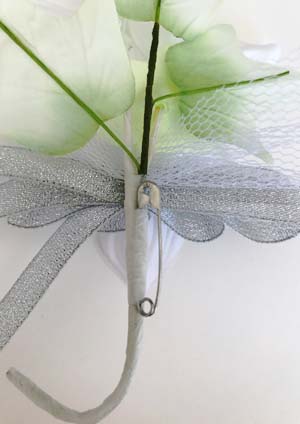 シルバーのリボンとチュールで華やかさUP!人気のコサージュです。